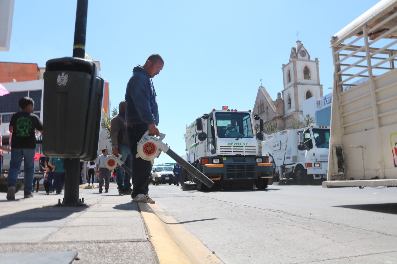 Con tres barredoras y 15 trabajadores manuales, se llevó a cabo la limpieza de las avenidas y calles del primer cuadro de la ciudad al finalizar el desfile por el 16 de septiembre, desde la avenida 20 de Noviembre a lo largo de la avenida Venustiano Carranza, hasta la avenida Juárez.