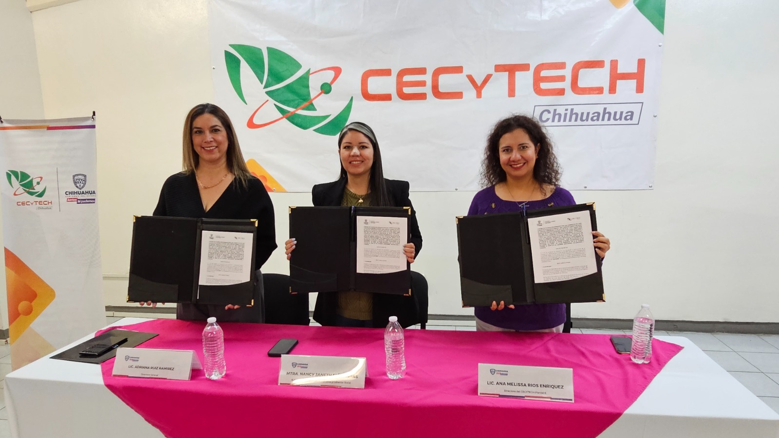 El acuerdo interinstitucional fue firmado por Adriana Ruiz Ramírez, directora general del Cecytech y Nancy Frías Frías, subsecretaria de Grupos Vulnerables y Cohesión Social.