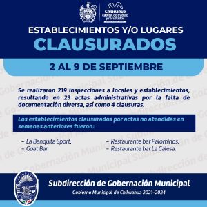El Gobierno Municipal, a través de la Subdirección de Gobernación de la Secretaría del H. Ayuntamiento, informa que del 2 al 9 de septiembre se realizaron 219 inspecciones a locales y establecimientos, resultando en 23 actas administrativas por falta de documentación diversa, así como cuatro clausuras.