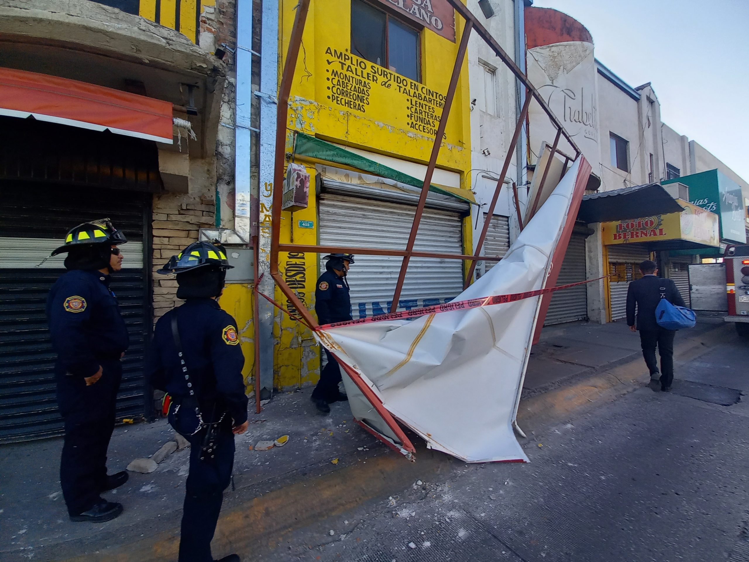 Fue sobre la calle Ocampo a la altura de la Víctoria donde cayó por razones desconocidas la estructura de metal del un negocio de botas por lo que llamaron al 911.