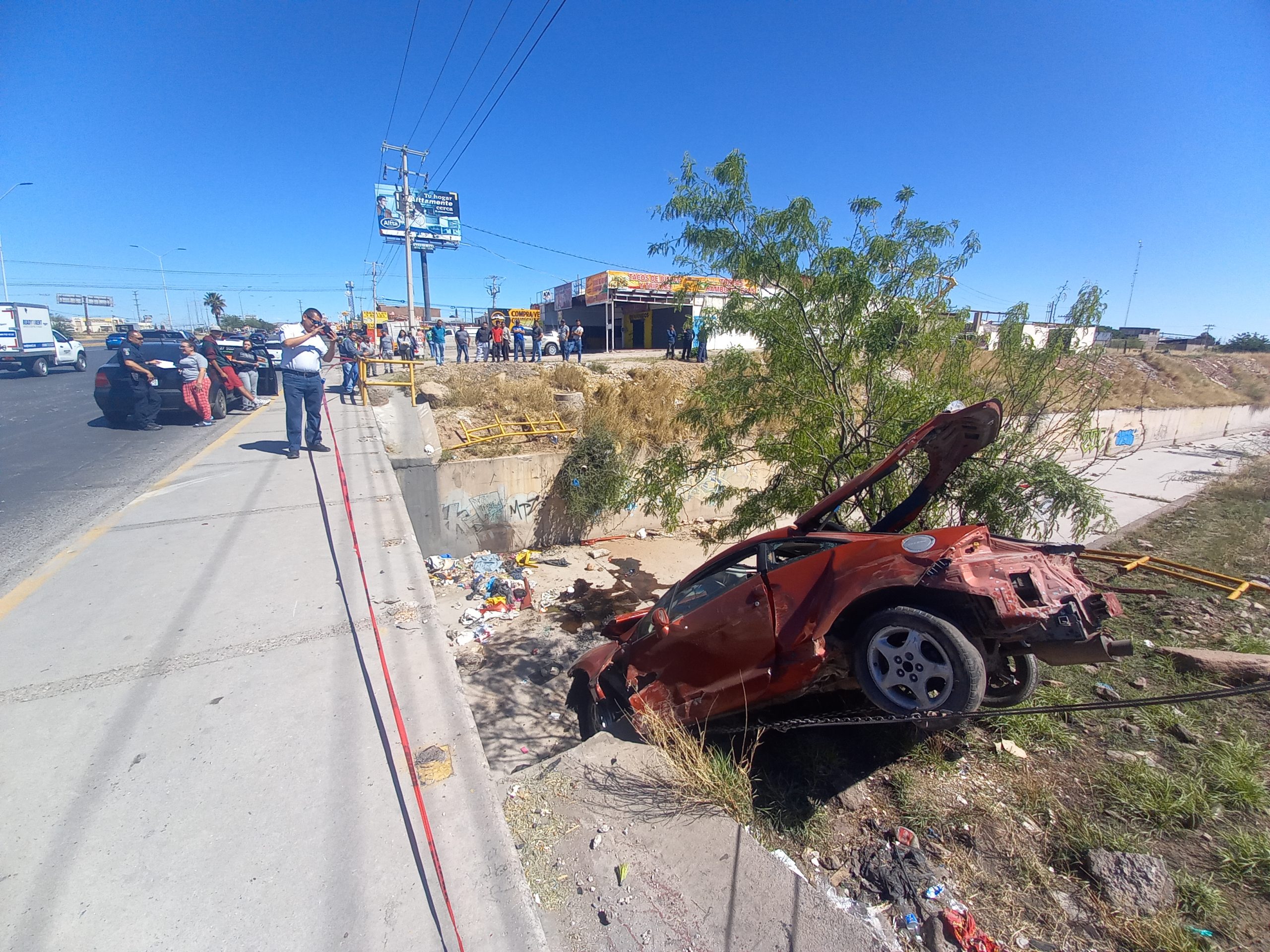 Un auto compacto termino en el fondo denun canal de desagua de la colonia 20 Aniversario tras un altercado vehícular.