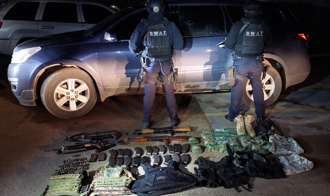 Elementos del Grupo Especial SWAT de la Secretaría de Seguridad Pública del Estado (SSPE), localizaron y aseguraron un vehículo con reporte de robo, 4 armas largas, cargadores, cartuchos, droga, equipo y vestimenta táctica con la leyenda “Ejercito Mexicano” tras una persecución por calles de ciudad Cuauhtémoc.