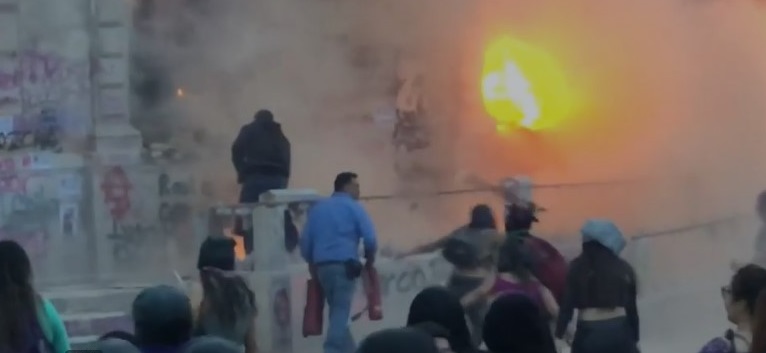 Manifestantes se fueron a los golpes contra empleado de gobierno que, al ver los ventanales del edificio en llamas, intento apagarlas y llevaba consigo un extinguidor, pero un grupo de mujeres le pegaban con palos y los puños.